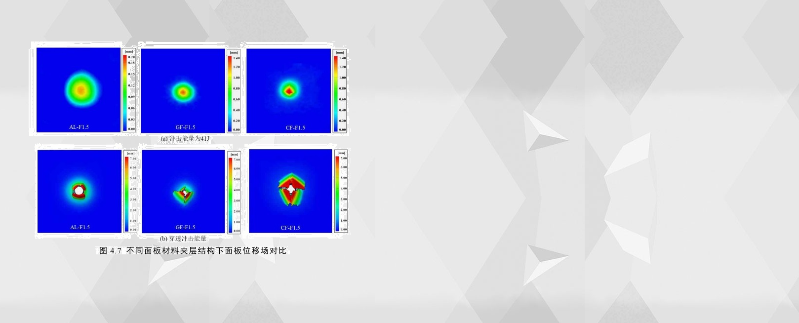 在低速沖擊實驗研究過程中,面板的變形量(尤其是下面板的變形量)對防護性能的評估極為重要,因此分析夾層結(jié)構(gòu)下面板最大變形是十分必要的,圖4.7(a)為三種面板厚度為1.5mm的夾層結(jié)構(gòu)在沖擊能量為41J下的下面板變形位移場;通過比較三者的變形可以看出,鋁合金夾層結(jié)構(gòu)的下面板變形面積是最大的,而其沖頭垂直方向的最大變形量是最小的;此外CF-F1.5與GF-F1.5比較而言,兩者的變形面積相差不大,但前者的最大變形量更大,并且可以看到明顯的十字形裂紋。圖4.7(b)為同配置條件下的試件在穿透沖擊能量下的下面板變形位移場;可以看出,AL-F1.5的下面板變形位移場的形狀為圓形,相比之下,CF-F1.5的下面板可以看到呈菱形的穿孔且位移變形的區(qū)域比前者要大一些,此外,GF-F1.5的位移場的大小和破壞形式介于其余兩者之間。從以上的分析中也可以得出,在同等尺寸配置,鋁合金夾層結(jié)構(gòu)耐沖擊性能更好,而碳纖維夾層結(jié)構(gòu)的耐沖擊性能可能是最差的。