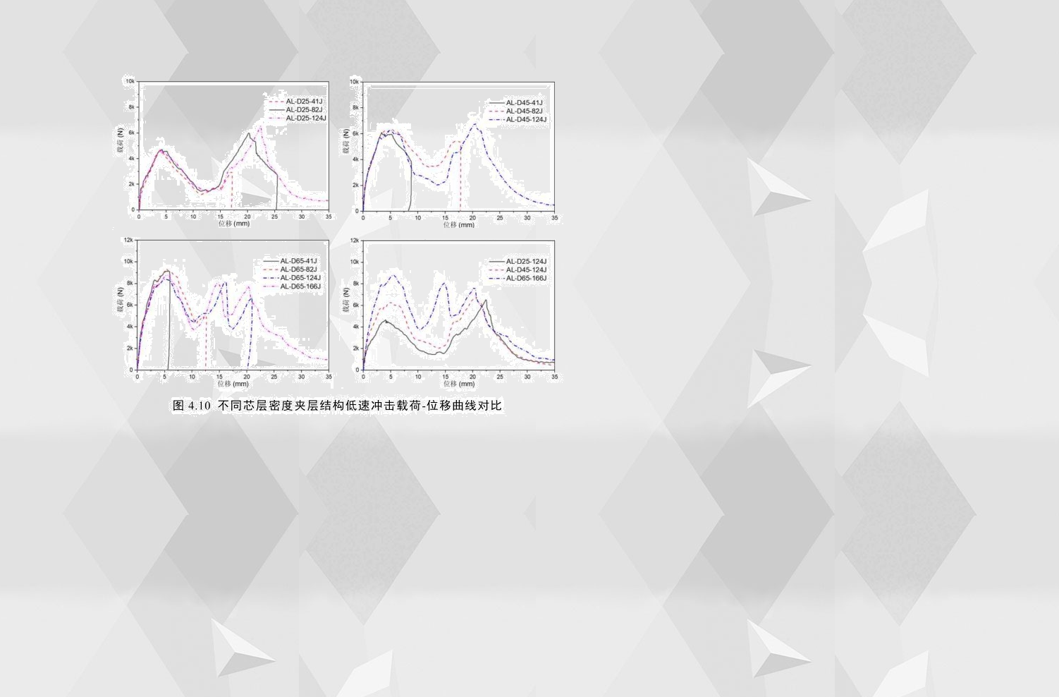 為了了解泡沫芯層對夾層結(jié)構(gòu)沖擊性能的影響,分別選擇了三種不同芯層密度和三種不同芯層高度的夾層結(jié)構(gòu)作為研究對象,需要特別說明的是,這六種配置的試件,其面板均由厚度相同的鋁合金制成。圖4.10為相同配置夾層結(jié)構(gòu)在不同沖擊能量下及不同芯層密度的試件在穿透能下的載荷-位移曲線,通過對比可以看出,當芯層密度從0.45g/cm3增加到0.65g/cm3時,載荷-位移曲線的形式發(fā)生了很大變化,曲線的峰值載荷由兩個變?yōu)槿齻€,且曲線的波峰和波谷均隨芯層密度的增加而增加。